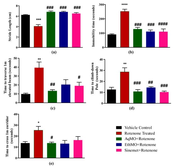 Stride length measurements were 6.2 ± 0.09 cm in the vehicle control, 4.07 ± 0.32 cm in rotenone-treated, 6.8 ± 0.14 cm in AqMO, 6.8 ± 0.2 cm in EthMO and 6.51 ± 0.018 cm in Sinemet-treated mice. A significant (p < 0.001) reduction in stride length following rotenone treatment compared to the vehicle control was observed in the extract-treated and Sinemet-treated groups (Figure 2a). Similarly, the extent of immobility, while hung from the tail, was 90 ± 5.05 s in the vehicle, 252 ± 15.06 s in rotenone, 103.67 ± 5.93 s in AqMO, 115.25 ± 7.16 s in EthMO and 110 ± 19.1 s in Sinemet-treated mice. The extent of immobility in rotenone was augmented significantly (p < 0.001) compared to vehicle control, while the mice in treatment (AqMO, EthMO and Sinemet) groups had significantly reduced rotenone-mediated immobility (Figure 2b).