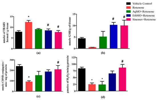 MO seed extracts partially restore the antioxidant capacities of brain of rotenone-treated mice. (a) A higher extent of lipid peroxidation in rotenone-treated mice was significantly prevented in EthMO- and Sinemet-administered mice groups. (b) The levels of reduced glutathione were considerably reduced in rotenone-treated mice brains, while a significant increase in reduced glutathione levels was observed in EthMO- and Sinemet-treated mice. (c) The activity of GST was significantly reduced in rotenone-treated mice, and a non-significant increase in GST activity was observed in MO extract-treated mice. (d) A sharp decline in CAT activity was observed in rotenone-treated and AqMO-treated mice; however, a sharp but non-significant increase in CAT activity was observed in EthMO-treated mice. Data are represented as mean ± SEM; n = 6/group. * p < 0.05 vs. vehicle control; # p < 0.0 vs. rotenone-treated. One-way ANOVA followed by Bonferroni post hoc analysis.