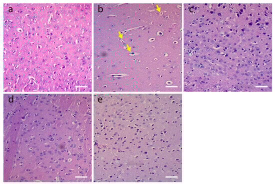 Histological investigation of Hematoxylin and Eosin-stained mice mid-brain sections (5 µm thick) viewed at 100× magnification under bright-field microscope. Scalebar: 100 µm. (a) Normal healthy neurons in control. (b) Reduced numbers of neurons in rotenone-treated mice with central chromatolysis (yellow arrows). (c) AqMO extract treatment prevents the loss of mid-brain neurons, as also seen in (d) EthMO extract-treated brain slices. (e) Sinemet treatment rescued the neuron loss in mid-brain of mice.
