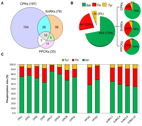Identification and phosphorylation status of the CSS kinase clients. (A) Venn diagram analysis shows the number of unique and overlapped clients identified by CPKs, SnRKs, and PPCKs. The amino acid residues phosphorylated by CPKs, PPCKs, or SnRKs were identified using the synthetic peptide library and the KiC assay. (B) The pie chart indicates the overall proportion of Ser, Thr, and Tyr O phosphorylation sites identified. (C) The histograms indicate the target residue specificity of individual protein kinases.