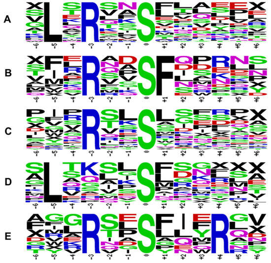 Amino acid sequences flanking the experimentally determined sites of peptide O phosphorylation. (A) .L.R..S…… (CPK3/17); (B) …R..SF….. (CPK17); (C) …R..S…… (CPK17/24); (D) .L….S…… (CPK17); (E) …R..S…R.. (CPKs). The CDPKs show preference for a basic residue (R/K) at positions −3/+4 and a hydrophobic residue (L/F) at positions −5/+1 to P-Ser (S). Sequence pileups were generated using the http://weblogo.berkeley.edu/logo.cgi algorithm (accessed on 14 April 2024).