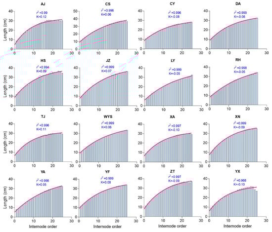 The coefficient of determination (r2) illustrates the strong positive correlation between the internode length and internode order across various Moso bamboo populations. Each abbreviation code, such as AJ, CS, CY, etc., represents 16 sampling regions in China. The r2 value represents the coefficient of determination, indicating the strength of the correlation, while the K value represents the rate constant expressed in inverse units of the variable represented on the X-axis.