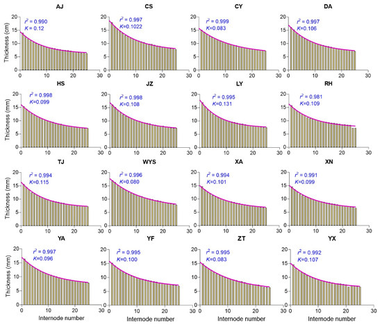 The correlation analysis illustrates the relationship strength (r2) between the internode thickness and internode order across various Moso bamboo populations. Each abbreviation code, such as AJ, CS, CY, etc., represents 16 sampling regions in China. The r2 value represents the coefficient of determination, indicating the strength of the correlation, while the K value represents the rate constant expressed in inverse units of the variable represented on the X-axis.