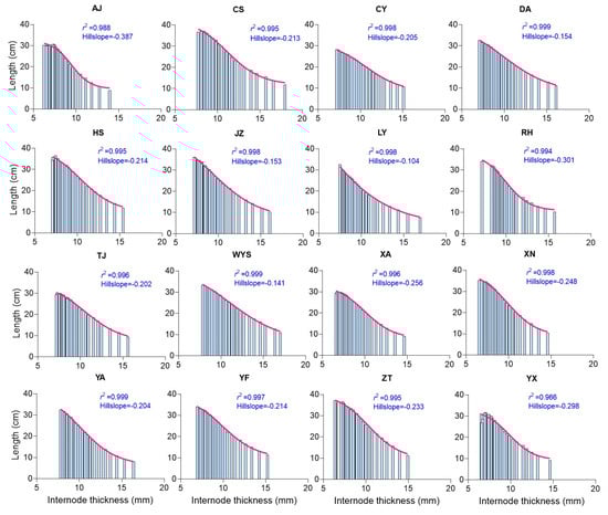 The correlation analysis illustrates the relationship strength (r2) and hillslope values between the internode thickness and internode length across various Moso bamboo populations. Each abbreviation code, such as AJ, CS, CY, etc., represents 16 sampling regions in China. The r2 value represents the coefficient of determination, indicating the strength of the correlation, while the negative hillslope value indicates the rate of change in the dependent variable (internode thickness) for a one-unit increase in the independent variable (internode length). For example, the hillslope value of −0.387 indicates that for every one-unit increase in internode thickness, the internode length decreases by 0.387 units on average, as observed in the AJ population.
