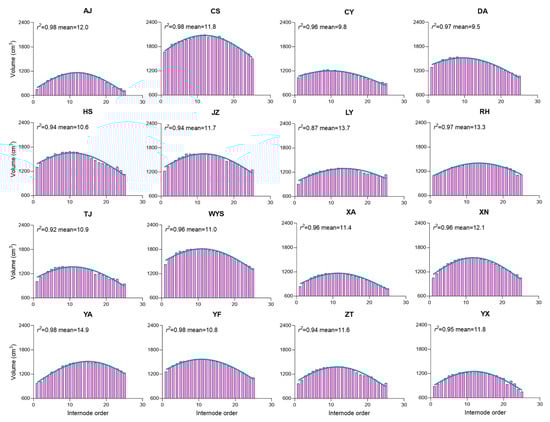 The coefficient of determination (r2) illustrates the relationship between the internode volume and internode order, suggesting changes in the internode volumes along the culm height across various Moso bamboo populations. Each abbreviation code, such as AJ, CS, CY, etc., represents 16 sampling regions in China. The r2 value indicates the strength of the correlation, while the mean internode order value illustrates that the highest average internode volume occurs at the middle of the culm. For example, in the AJ population, the highest average internode volume occurs at the 12th internode.