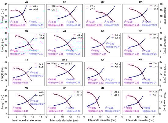The correlation coefficients and hillslope values illustrate the relationship between the various parameters, such as the internode length, thickness, and diameter, across various Moso bamboo populations. Each abbreviation code, such as AJ, CS, CY, etc., represents 16 sampling regions in China. The r2 value indicates the correlation coefficient, reflecting the strength of the correlation, while the hillslope value indicates the rate of change between variables. A positive hillslope value signifies an increasing trend, whereas a negative value indicates a decreasing trend, as observed in the AJ population. The letters L and T on the right side of each graph represent internode length (cm) and thickness (mm), respectively. The graph line in purple-blue represents the relationship between the internode diameter and thickness, while the red line represents the relationship between the internode diameter and length, with the internode diameter represented on the X-axis.