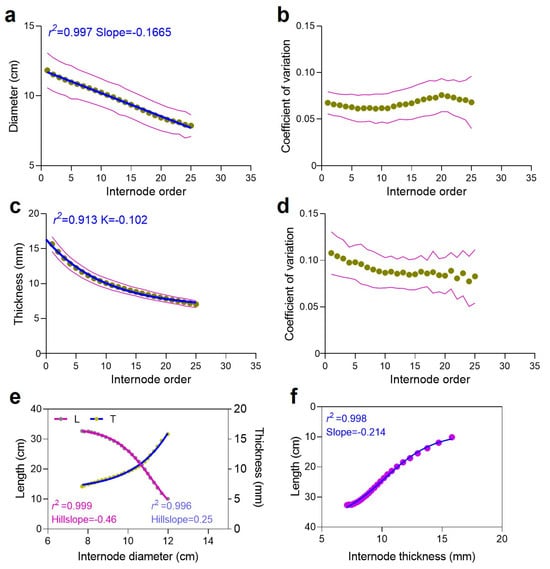 Altogether, as the internode order increases, the internode diameter decreases, with an r2 value of 0.997 and a negative slope value of −0.1665, indicating a gradual decline rather than a steep decline (Figure 6a). The coefficient of variation of the internode order falls between >0.05 and <0.10 (Figure 6b). Similarly, as the internode order increases, the internode thickness decreases (Figure 6c), with the coefficient of variation of the internode order falling between >0.05 and <0.15 (Figure 6d). Notably, when the internode diameter increases, the internode length decreases (Figure 6e). Conversely, when the internode diameter increases, the internode thickness increases (Figure 6e). Likewise, as the internode thickness increases, the internode length decreases (Figure 6f). These results indicate that Moso bamboo follows a pattern of gradual decline and increase rather than steep declines and increases, analogous to a building construction where the foundation is typically designed to be robust to support the structure, with the load gradually decreasing as the number of floors increases. Similarly, Moso bamboo exhibits a comparable pattern, where the base of the culm is strong to support the plant’s weight, with a gradual decrease in internode size and volume as it grows taller.