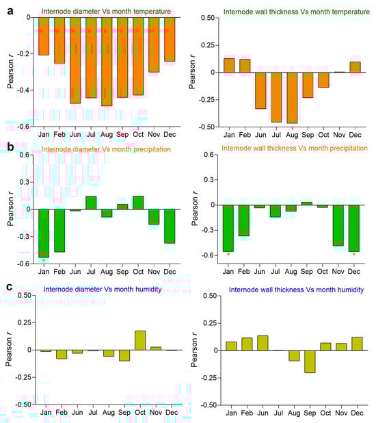 The Pearson correlation between environmental factors and the internode diameter and thickness of Moso bamboo, collected from 16 Moso bamboo populations in China. (a) The internode diameter with monthly temperature, and the internode thickness with monthly temperature. (b) The internode diameter with monthly precipitation, and the internode thickness with monthly precipitation. (c) The internode diameter with monthly humidity, and the internode thickness with monthly humidity. The positive values (such as 0.3 or 0.6) and negative values (such as −0.3 or −0.6) in the Pearson r value represent positive and negative correlations, respectively. The symbol (*) represents significant correlations defined at p < 0.05.