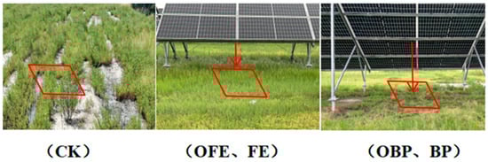 On 8 July 2023, a sample plot was arranged in the vegetated part of the solar photovoltaic facility, and the whole photovoltaic power station was randomly divided into six areas. Of these six areas, three were selected to receive organic fertilizer in the form of pure sheep manure, produced by Bayannaoermeng Sheep Wetting Agriculture Co., Ltd., Inner Mongolia Autonomous Region, China. Moreover, three photovoltaic panels were randomly selected in each area, totaling 18 photovoltaic panels. In addition, a portion of grassland was selected around each photovoltaic panel as a control grassland; a total of nine control grasslands were selected. In view of the differences in temperature, light, soil temperature, and soil water content at different locations under the photovoltaic panel, quadrats were arranged in front of the eaves (FE) and right below the center (BP) of each photovoltaic panel, respectively. Fertilized locations in front of and under each photovoltaic panel were denoted as OFE and OBP, respectively; unfertilized locations in front of and under each photovoltaic panel were denoted as FE and BP, respectively; and the control grassland was referred to as CK (Figure 1). A total of 54 quadrats were set; the size of each quadrat was 1 × 1 m, and the fertilization rate was 1000 kg/ha. After one month, vegetation and soil samples were collected at various locations in the selected area, and field measurements were carried out.