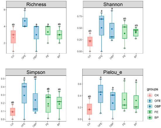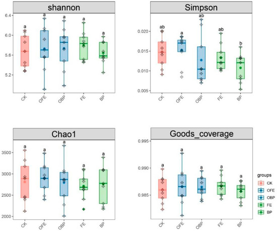 Box plot of soil bacteria alpha diversity index (CK: undisturbed grass around the photovoltaic panel; OFE: front edge of the fertilized part of the panel; FE: front edge of the unfertilized part of the panel; OBP: below the center of the fertilized section of the panel; BP: below the center of the unfertilized part of the panel. The midline of the box represents the median; the upper edge and the lower edge are the maximum and minimum values, respectively; and the points outside the edge represent outliers). Note: Different letters mean significant differences between different positions (p < 0.05), the same letters mean no significant differences between different positions (p < 0.05).