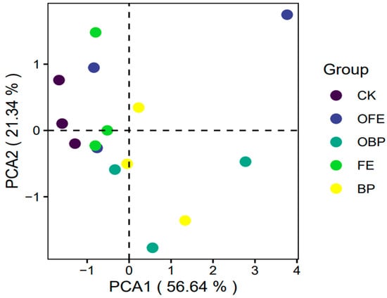 Principal coordinate analysis (PCA) of plant community composition at different positions under the photovoltaic panels (CK: undisturbed grass around the photovoltaic panel; OFE: front edge of the fertilized part of the panel; FE: front edge of the unfertilized part of the panel; OBP: below the center of the fertilized section of the panel; BP: below the center of the unfertilized part of the panel).