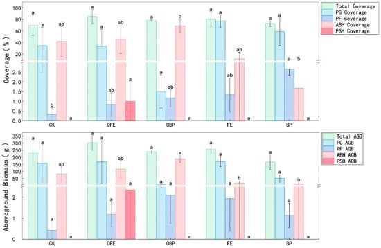 The PCA results showed that PCA1 and PCA2 explained 56.64% and 21.34% of the variation in plant community composition, respectively. There were significant differences in the plant community composition between different restoration measures and the control group (p < 0.05), indicating that different restoration measures changed the plant community composition and that the plant composition differed significantly across different locations under the photovoltaic panels (p < 0.05) (Figure 3 and Figure 4). There was no significant difference in total vegetation coverage and total aboveground biomass between the treatments under photovoltaic panels and organic fertilizer addition compared with CK (p < 0.05). However, the overall trend is upward, and the increase in OFE is greater; the PG coverage of FE (the front eaves of photovoltaic panels in unfertilized areas) was significantly different from that of CK, increasing by 125.3% (p < 0.05). The PF coverage of FE and BP was significantly different from that of CK, increasing by 85.5% and 87.2%, respectively (p < 0.05). The ABH coverage of OFE was increased significantly by 53.41% compared with CK (p < 0.05). There was no significant difference in PSH coverage, PG aboveground biomass, PF aboveground biomass, and PSH aboveground biomass compared with CK (p < 0.05). The ABH aboveground biomass of OFE was significantly increased by 53.71% (p < 0.05) compared with CK (Figure 4).