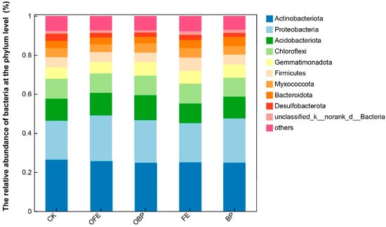 The relative abundance of bacteria at the phylum level (CK: undisturbed grass around the photovoltaic panel; OFE: front edge of the fertilized part of the panel; FE: front edge of the unfertilized part of the panel; OBP: below the center of the fertilized section of the panel; BP: below the center of the unfertilized part of the panel).