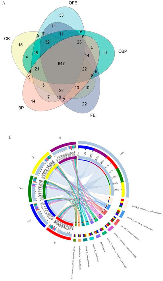 (A) Soil bacteria genus-level Venn diagram. (B) Soil bacteria genus-level Circos diagram (CK: undisturbed grass around the photovoltaic panel; OFE: front edge of the fertilized part of the panel; FE: front edge of the unfertilized part of the panel; OBP: below the center of the fertilized section of the panel; BP: below the center of the unfertilized part of the panel).