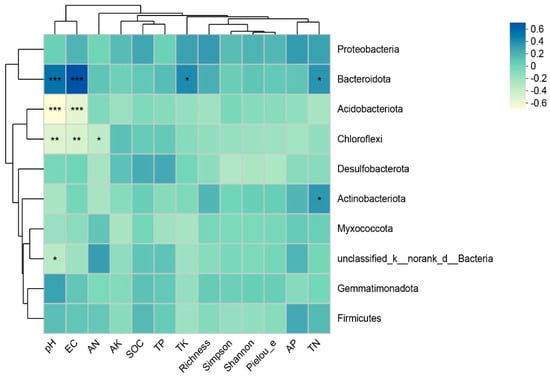 Pearson’s correlation analysis showed that Actinobacillus was positively correlated with TN, and Proteobacteria was negatively correlated with AK. Bacteroides were positively correlated with TK and TN and positively correlated with pH and EC. Acidobacteria was negatively correlated with pH and EC. Chloroflexi was negatively correlated with AN and negatively correlated with pH and EC. Unclassified_k_norank_d_Bacteria was negatively correlated with pH (Figure 9).