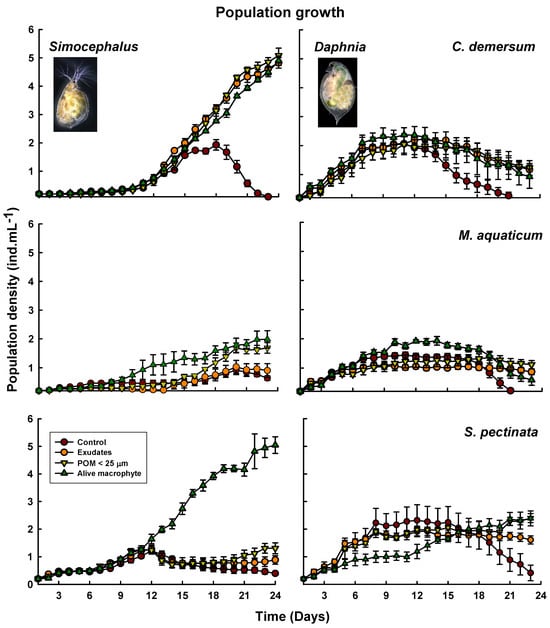 Macrophyte exudates constitute a substantial portion of total dissolved organic matter (DOM) in vegetated habitats [15], and numerous studies elucidate their role in enhancing primary and secondary productivity [43]. Mesocosm experiments conducted by Balzer et al. [44] delineate how allochthonous DOM stimulates autotrophs and mixotrophs, playing a pivotal role in zooplanktonic secondary production. The DOM generated by submerged macrophytes primarily comprises protein-like substances exhibiting high activity, with discernible variations observed among different aquatic plants. Some investigations have documented that DOM significantly influences alterations in microbial community composition [43]. In our population growth experiments, the treatments involving particulate organic matter smaller than 25 µm (POM < 25 µm) were statistically comparable to exudates concerning Simocephalus and Daphnia. This suggests that the microbiota and detritus associated with macrophytes may not serve as a substantial nutritional food source for cladocerans under these conditions.