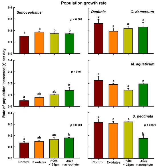Population growth rates (r) per day of Simocephalus cf. mixtus and Daphnia cf. pulex under the influence of exudates, particulate organic matter smaller than 25 µm (POM < 25 µm) + exudates, and living macrophytes derived from Ceratophyllum demersum, Myriophyllum aquaticum, and Stuckenia pectinata. Mean ± SE data are shown based on four replicates. Bars with equal letters are not statistically significant (p > 0.05, Tukey test).