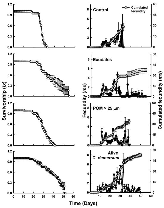 Life table experiments showed that the survivorship (lx) of Simocephalus notably increased in the presence of exudates and living C. demersum, with individuals living up to 54 and 52 days, respectively, compared to 38 days in the POM < 25 µm treatment, and 33 days in the control group. The maximum fecundity (mx) values were relatively similar between the control and POM treatments, averaging 3.5 and 3.4 neonates per female−1, respectively, and cumulated fecundity around 30 neonates per female−1. In contrast, treatments with exudates and living macrophytes exhibited higher values of 4.6 and 6.33 neonates per female−1 as well as a cumulated fecundity of 36 and 52 neonates per female−1, respectively (Figure 3).