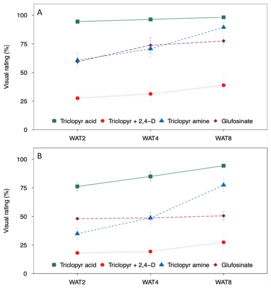 Mean visual ratings of Tahitian bridal veil (Gibasis pellucida) (A) and small-leaf spiderwort (Tradescantia fluminensis) (B) control following treatment with selected herbicides (triclopyr acid, triclopyr amine + 2,4-D amine, triclopyr amine, and glufosinate) at 2, 4, and 8 weeks after treatment (WAT). Means and standard error bars are shown and are pooled over two experimental runs.