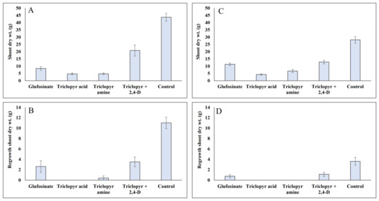 Mean Tahitian bridal veil (Gibasis pellucida) shoot dry weight (A) and regrowth (B) (presented in grams) following treatment with selected herbicides including triclopyr acid, triclopyr amine + 2,4-D amine, triclopyr amine, and glufosinate. Mean shoot dry weight and regrowth for small-leaf spiderwort (Tradescantia fluminensis) are shown in graphs (C,D). Mean shoot dry weight for both species (A,C) was collected at 8 weeks after treatment, while shoot regrowth (B,D) was collected at 4 weeks following the initial harvest (12 weeks after the initial treatment).