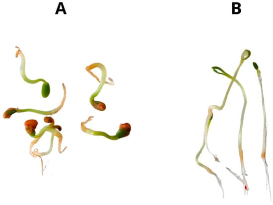 White clover sprouts on the 6th day of germination in simulated microgravity ((A), sample 6LM) and normal gravity conditions ((B), sample 6L). Abbreviations of the sprouts’ samples: 6LM—6-days-old sprouts grown in standard light and simulated microgravity conditions; 6L—6-days-old sprouts grown in standard light conditions.