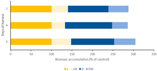 Changes in the biomass of the white clover sprouts presented as % of control (weight of control sprouts 5L, 6L, and 7L). Abbreviations of the sprouts’ samples: L—the sprouts grown in standard light conditions; D—the sprouts grown in darkness; LM—the sprouts grown in standard light and simulated microgravity conditions; DM—the sprouts grown in darkness and simulated microgravity conditions.