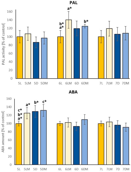 Abscisic acid (ABA) amount and phenylalanine ammonia-lyase (PAL) activity in the white clover sprouts presented as the % of control (control: the amount of ABA and PAL activity in the 5L, 6L, and 7L sprouts). Significant differences were calculated for each day of harvesting separately and were marked with pairs of letters a–c (*: p ≤ 0.05). Abbreviations of the sprouts’ samples: L—the sprouts grown in standard light conditions; D—the sprouts grown in darkness; LM—the sprouts grown in standard light and simulated microgravity conditions; DM—the sprouts grown in darkness and simulated microgravity conditions. The numbers placed before each abbreviation indicate harvest days (5, 6, and 7 days).