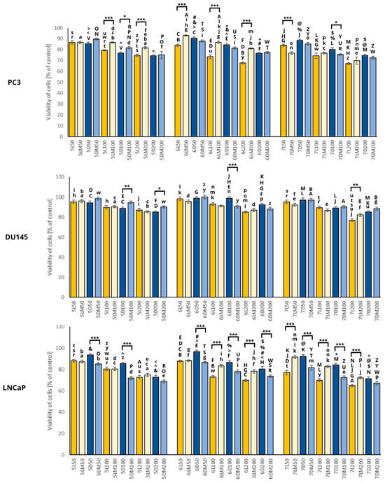 Viability of the PC3, DU145, and LNCaP cells after 24 h incubation with the white clover sprout extracts used in different concentrations (50, 100, and 200 μg/mL). Significant differences between the cells treated with the extracts from the white clover sprouts grown in microgravity conditions versus control sprouts were marked with an upper black line (***: p ≤ 0.001; **: p ≤ 0.01; *: p ≤ 0.05). Significant differences between different days of harvesting (e.g., 5LM50 vs. 6LM50), concentrations (e.g., 5LM50 vs. 5LM100) of extracts, and light conditions (e.g., 5LM50 vs. 5DM50) were marked with pairs of letters a–z, A–Z, and special signs (@, <, >, ^, %, &, #, +, and $). Abbreviations of the sprouts’ samples: L—the sprouts grown in standard light conditions; D—the sprouts grown in darkness; LM—the sprouts grown in standard light and simulated microgravity conditions; DM—the sprouts grown in darkness and simulated microgravity conditions. The numbers placed before each abbreviation indicate harvest days (5, 6, and 7 days). The numbers placed after each abbreviation indicate concentration (50, 100, and 200 μg/mL).