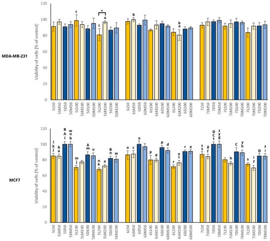 Viability of the MDA-MB-231 and MCF7 cells after 24 h incubation with the white clover sprout extracts used in different concentrations (50, 100, and 200 μg/mL). Significant differences between the cells treated with the extracts from the white clover sprouts grown in microgravity conditions versus control sprouts were marked with an upper black line (*: p ≤ 0.05). Significant differences between different days of harvesting (e.g., 5LM50 vs. 6LM50), concentrations (e.g., 5LM50 vs. 5LM100) of extracts, and light conditions (e.g., 5LM50 vs. 5DM50) were marked with pairs of letters a–z and A–D. Abbreviations of the sprouts’ samples: L—the sprouts grown in standard light conditions; D—the sprouts grown in darkness; LM—the sprouts grown in standard light and simulated microgravity conditions; DM—the sprouts grown in darkness and simulated microgravity conditions. The numbers placed before each abbreviation indicate harvest days (5, 6, and 7 days). The numbers placed after each abbreviation indicate concentration (50, 100, and 200 μg/mL).
