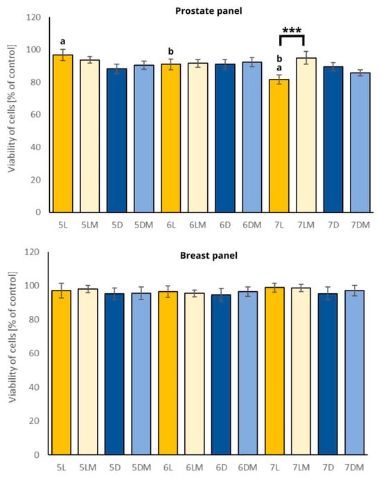 Viability of the PNT2 and MCF10A cells after 24 h incubation with the white clover sprout extracts (200 μg/mL). Significant differences in the viability of the cells treated with the extracts from the white clover sprouts grown in microgravity conditions versus the sprouts grown in normal gravity were marked with an upper black line (***: p ≤ 0.001). Significant differences between different days of harvesting (e.g., 5L vs. 6L) were marked with pairs of letters a,b. Abbreviations of the sprouts’ samples: L—the sprouts grown in standard light conditions; D—the sprouts grown in darkness; LM—the sprouts grown in standard light and simulated microgravity conditions; DM—the sprouts grown in darkness and simulated microgravity conditions. The numbers placed before each abbreviation indicate harvest days (5, 6, and 7 days).