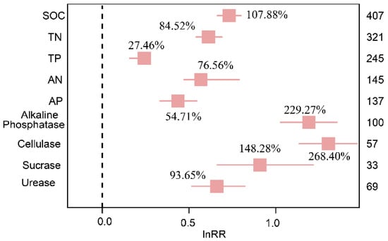 The overall effects of BSC mulching on SOC, TN, TP, AN, AP, Alkaline Phosphatase, Cellulase, Sucrase, and Urease. The label points represent the mean, and the error bars represent the 95% confidence interval. The integer value is the number of observations included in the response variable, and the percentage represents the percentage increase/decrease in the experimental group relative to the control group after conversion.