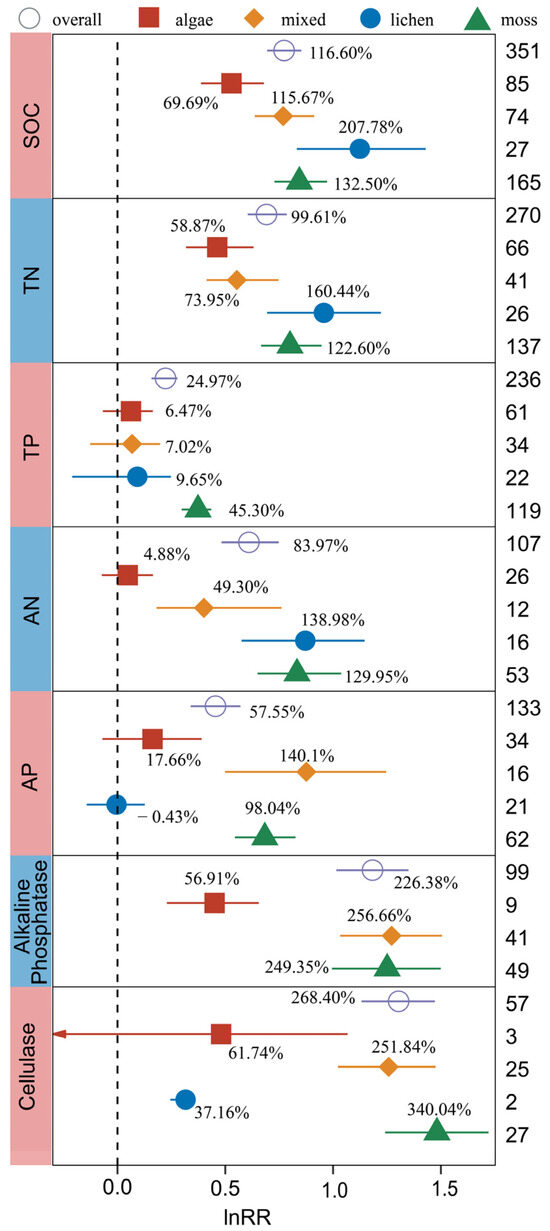 The effects of biocrust types on SOC, TN, TP, AN, AP, Alkaline Phosphatase, and Cellulase. The label points represent the mean, and the error bars represent the 95% confidence interval. The integer value represents the number of observations contained in the response variable. The percentage represents the percentage of increase/decrease in the experimental group relative to the control group after conversion. The arrow represents that the 95% confidence interval of the effect value of the study is beyond the display range of the figure.
