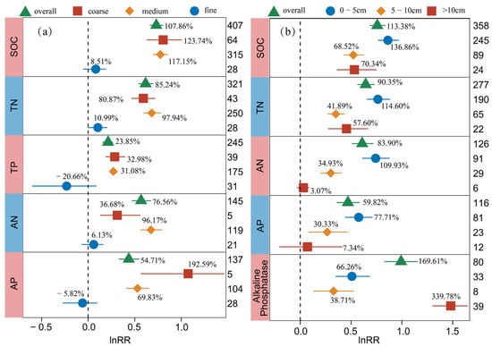 Response of SOC, TN, TP, AN, AP, and Alkaline Phosphatase to biocrust cover under the influence of soil texture (a) and soil depth (b). The label points represent the mean, and the error bars represent the 95% confidence interval. The integer value is the number of observations contained in the response variable. The percentage represents the percentage of increase/decrease in the experimental group relative to the control group after conversion.