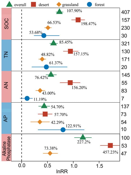 Compared with forest and grassland, the BSCs in desert ecosystems had the best effect on the increases in SOC, TN, and AN content. Specifically, the increase in SOC in desert ecosystems (198.47%) was significantly higher than that in grassland ecosystems (66.53%) and forest ecosystems (53.68%) (Figure 4). For TN, the increase order across different ecosystems was desert (157.15%) > forest (61.37%) > grassland (48.82%). A significant difference was observed in the TN increase between desert (157.15%) and grassland ecosystems (48.82%) (p < 0.05), similar to AN. Regarding AP, there were significant increases in all three ecosystems, with the highest observed in forest systems (122.91%), followed by desert ecosystems (57.70%) and grassland ecosystems (42.29%). The increase in Alkaline Phosphatase driven by BSCs was also significantly affected by the ecosystem type. The largest increase effect was observed in the desert ecosystem (457.23%), followed by the grassland ecosystem (73.38%), and there was a significant difference in the increase between them (p < 0.05).
