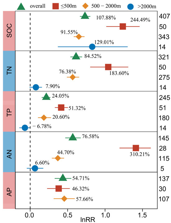 The responses of SOC, TN, TP, AN, and AP to BSCs were related to altitude, and their values were significant (p < 0.05) (Table S1). Under the influence of altitude, the contents of SOC, TN, TP, and AN increased significantly at ≤500 m and 500–2000 m, and the increase rate under the two levels showed significant difference (p < 0.05) (Figure 5). On the whole, the above variables (SOC, TN, TP and AN) show a trend that the increase of low altitude (≤500 m) was greater than those of middle and high altitude (500–2000 m, ≥2000 m).