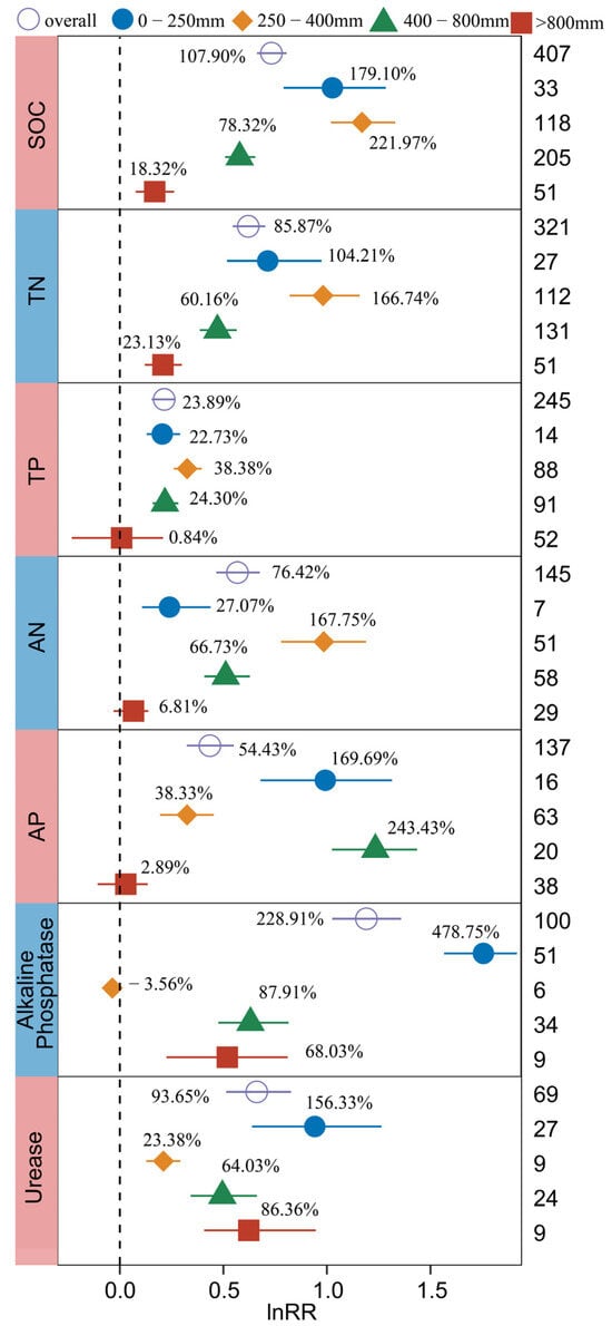 The study observed a consistent trend in the increase in SOC and TN influenced by BSCs due to annual average rainfall, with the highest increases (221.97% for SOC, 166.74% for TN) occurring within the annual average rainfall range of 250–400 mm, followed by 0–250 mm, 400–800 mm, and >800 mm (Figure 6). The increase in AN in the range of 250–400 mm (167.75%) was the largest. The increase in AP in the range of 250–400 mm (38.33%) was significantly lower than those in the range of 0–250 mm (169.69%) and 400–800 mm (243.43%), respectively. The BSCs with an average annual rainfall of 0–250 mm had the greatest effect on the increase in Urease (156.33%) and Alkaline Phosphatase (478.75%).
