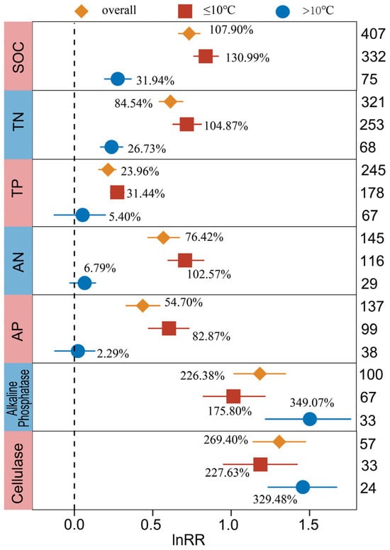 Response of SOC, TN, TP, AN, AP, Alkaline Phosphatase, and Cellulase to biocrusts cover under the influence of annual average temperature. The label points represent the mean, and the error bars represent the 95% confidence interval. The integer value is the number of observations contained in the response variable. The percentage represents the percentage of increase/decrease in the experimental group relative to the control group after conversion.