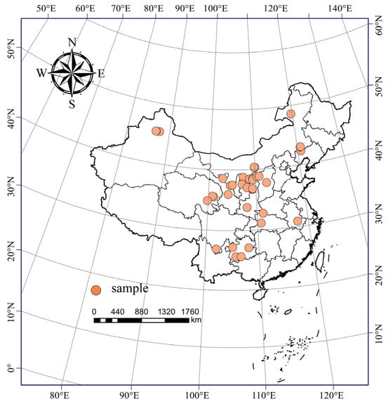 A total of 2856 literature studies were collected. According to the above criteria for the literature screening, the redundant and non-conforming studies were excluded. Ultimately, 71 peer-reviewed articles published between 2002 and 2022 were selected (see supplementary materials for details). The experimental studies were conducted at latitudes from 25°37′ N to 48°46′ N and longitudes from 84°31′ E to 119°45′ E. The annual mean temperature ranged from −0.3 to 20.1 °C, the annual mean rainfall ranged from 110 to 1390 mm, and the altitude ranged from 50 to 5011 m. The soil samples (experimental group and control group) in this study were from a depth range of 0–30 cm. The distribution of the study sites is shown in Figure 9.
