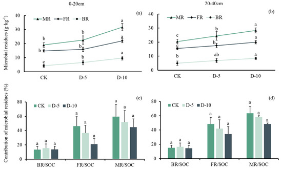 Changes in the influences of degradation on microbial residues (a,b) and the contribution of microbial residues to Moso bamboo soil (c,d). MR means microbial residues; FR means fungal residues; BR means bacterial residues. MR/SOC, FR/SOC and BR/SOC mean their contribution to soil organic C, and show their contribution to soil organic C. The letters represent differences between different degradation time in the same group.