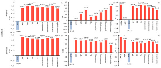 Pearson correlation analysis of soil carbon and microbial residues. *, ** and *** respectively represent p < 0.05, p < 0.01 and p < 0.001, represent the correlation significance. (a–c) are WSOC, MBC and SOC Pearson correlation analysis at 0–20 cm soil depth, (d–f) are WSOC, MBC and SOC Pearson correlation analysis at 20–40 cm soil depth.