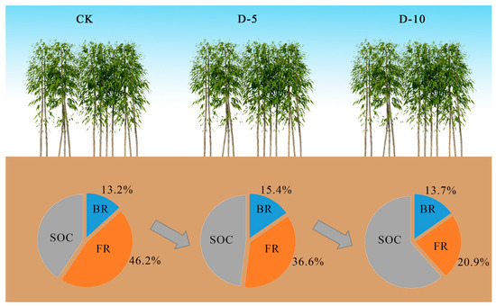 WSOC and MBC are two unstable C components of soil that can serve as indicators of soil biological quality [30]. In our study, degradation increased the WSOC content in two soil layers, with a higher increase in the D-10 layer. On one hand, degradation leads to the aging of Moso bamboo forest sample plots, an increase in the number of old bamboo, inadequate nutrient supply for new bamboo growth, and reduced root life activities in the soil. On the other hand, degradation also results in an increased number of dead bamboo, with their roots and stems accumulating on or within the soil surface before eventually decomposing into the soil carbon pool cycle. In addition to the aforementioned decrease in root life activity, it is evident that the supplementation of dead bamboo remains exceeds WSOC consumption significantly; thus, degradation has a significant impact on increasing WSOC levels in Moso bamboo forests [24]. The longer the degradation time, the more accelerated the soil slab, which reduces soil water content [19], leading to weakened soil respiration. Furthermore, the negative correlation between WSOC and water content (Figure 1) could be another reason for the increase in WSOC during degradation. This phenomenon underscores the role of surface litter as a key driver of short-term SOC dynamics. Furthermore, the mention of increased SOC content in deeper soil layers, attributed to the decomposition of bamboo roots, suggests that subsurface SOC dynamics might be influenced by longer-term ecological processes.