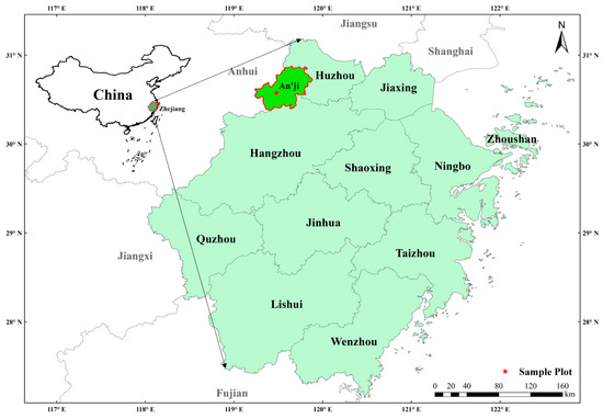 The study area is selected in An’ji County, Huzhou City, Zhejiang Province, between 119°14′~119°53′ east longitude and 30°23′~30°53′ north latitude (Figure 6). Anji County is located in the Yangtze River Delta region. Anji County belongs to the north subtropical monsoon climate zone, sufficient light, abundant precipitation, mild climate, four distinct seasons, topography relief height difference, vertical climate obvious. Anji County is the birthplace of the idea that “Lucid waters and lush mountains are invaluable assets”. The area of Moso bamboo forest in Anji County is 665.33 km2, accounting for 49.25% of the forest area respectively. Anji County is the hometown of bamboo in China. It ranks first in China in five indicators: bamboo quantity, annual output of bamboo, annual output value of bamboo industry, annual export value of bamboo products and comprehensive economic strength of bamboo industry. The main soil types in Zhejiang Province are red soil and yellow soil [50,51]. The soil of Moso bamboo forest in Anji County, Zhejiang Province was studied under different degradation of subtropical forest. Specifically, the density of Moso bamboo forests before degradation (continuous management) was 2400–2700 trees per hectare(Table 11). (We obtained permission from Anji County Forestry Bureau to sample Moso bamboo. The bamboo species are classified and identified by Anji County Forestry Bureau according to the requirements of China. Xuekun Cheng and Yongjun Shi also identified bamboo samples in the lab).