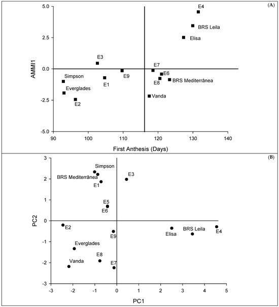 The dispersion of the evaluated cultivars based on the mean days to the first anthesis and IPCA1 is shown in Figure 1A. The cultivars BRS Leila (130), Elisa (127), BRS Mediterrânea (123), and Vanda (118) showed several days for the first anthesis greater than the general mean (114). On the other hand, the environments with the lowest number of days for the first anthesis were E1 (105), E2 (96), E3 (103), and E9 (110). Moreover, no IPCA1 scores close to zero were found for any of the assessed cultivars. The position of environments and genotypes could be observed on AMMI2 (Figure 1B). In this sense, none of the evaluated cultivars were close to the origin, and additionally, BRS Mediterrânea and Simpson were plotted close to the E1 and E3 biplot. The same trend was observed for BRS Leila and Elisa, which were plotted close to E4 (Figure 1B).