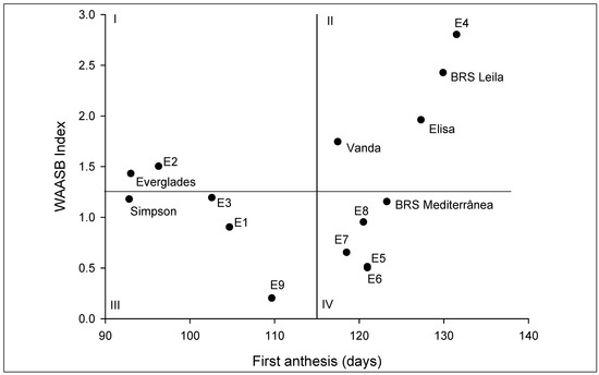 WAASB statistics analysis was performed to cluster the genotypes and environments based on the mean values of the first anthesis and stability. In this context, Figure 2 shows the biplot between the WASB index and the number of days to the first anthesis. As postulated by Olivoto et al. [23], all the tested environments and genotypes were divided into four quadrants. The genotype Everglades and environment E3 were placed in the first quadrant, which means that they had a performance that was below the average mean. The second quadrant enclosed BRS Leila, Elisa, and Vanda and environment E4, and they had performances above the average for the number of days to the first anthesis. The genotype and environments within the third quadrant were, respectively, BRS Mediterrânea and environments E5 to E8. The fourth quadrant was composed of genotype Simpson and environments E1, E2, and E9. Finally, as a compilation of all the stability statistics, the lowest values for the Average Sum of Ranks could be observed in BRS Mediterrânea (2.50), Elisa (2.67), and BRS Leila (2.67) (Table 4).
