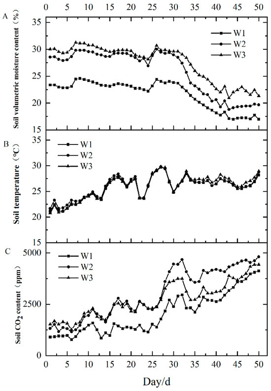 Dynamic variation in the soil volume moisture content, temperature, and CO2 content at 0–50 days. Note: (A) soil volume moisture content (%); (B) soil temperature (°C); (C) soil CO2 content (ppm). W1, W2, and W3, respectively, represent different experimental treatments. In this study, the effect of soil water vapor heat on stratification at 15 and 30 cm depths was investigated. However, it was found that the change rule of each factor at 15 and 30 cm depths was identical; thus, the use of an average value for soil water vapor heat to express the change rule.