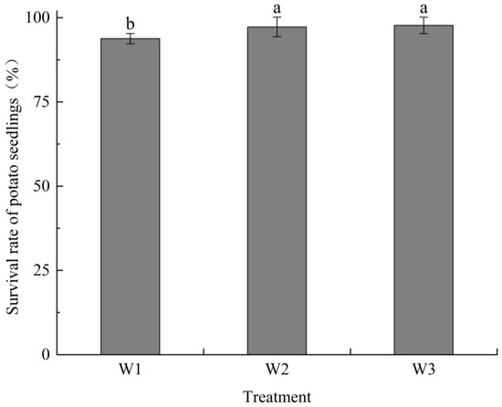 Survival rate of sweet potato seedlings after transplanting under different treatments. Different lowercase letters indicate significant differences (p < 0.05).