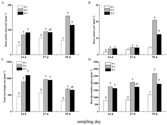 Variation in the root morphological parameters under different treatments. Note: (A) root surface area (cm2 plant−1); (B) root volume (cm3 plant−1); (C) total root length (cm plant−1); (D) toot tips number (piece plant−1). W1, W2, and W3 represent different treatments. Different lowercase letters in each treatment showed significant difference (p < 0.05).