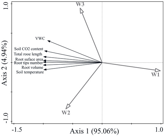 RDA analysis of soil internal environment and root morphological indices under different treatments. The coordinates of the first axis in the figure explain 95.06% of the variance, respectively, and the significances (according to Monte Carlo permutation tests) of all canonical axes were PA = 0.012, PB = 0.018, and PC = 0.026.