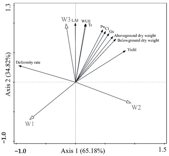 Correlation analysis also showed that the seedling leaf Pn, Ci, Gs, above- and belowground dry weight, and sweet potato yield were significantly positively correlated with the W2 treatment (p < 0.05), whereas the deformity rate, LAI, Tr, and WUE were significantly positively correlated with the W3 treatment (p < 0.05). All indicators were negatively correlated with the W1 treatment, except for the deformity rate. The deformity rate was significantly positively correlated with the W1 treatment (p < 0.05) and negatively correlated with all other indicators (Figure 5). Thus, irrigation treatment was an important factor influencing photosynthesis, carbon transfer, and yield in sweet potato seedlings.