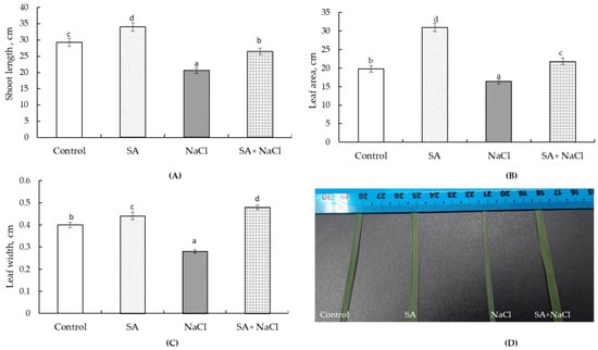 The effect of salt stress (100 mM NaCl) and pretreatment with 50 µM salicylic acid (SA) on shoot length (A), leaf area (B), and leaf width (C), and a visual assessment of sheet width (D) of wheat seedlings. All statistical differences were compared to the control group. The data represent the averages of three replications (n = 30) and standard errors; different letters on the top of the columns indicate statistically significant differences between the groups (p ≤ 0.05).
